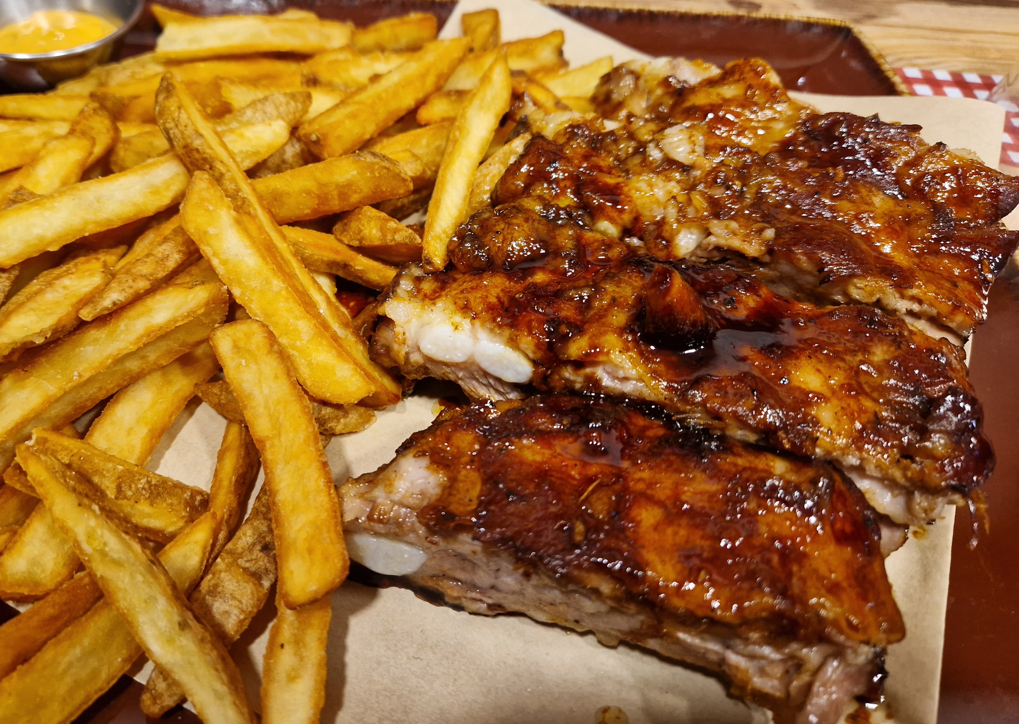 Tennessee glazed RibsMorbide costine di maiale in doppia cottura, glassate in salsa tennessee, con patatine fritte.
