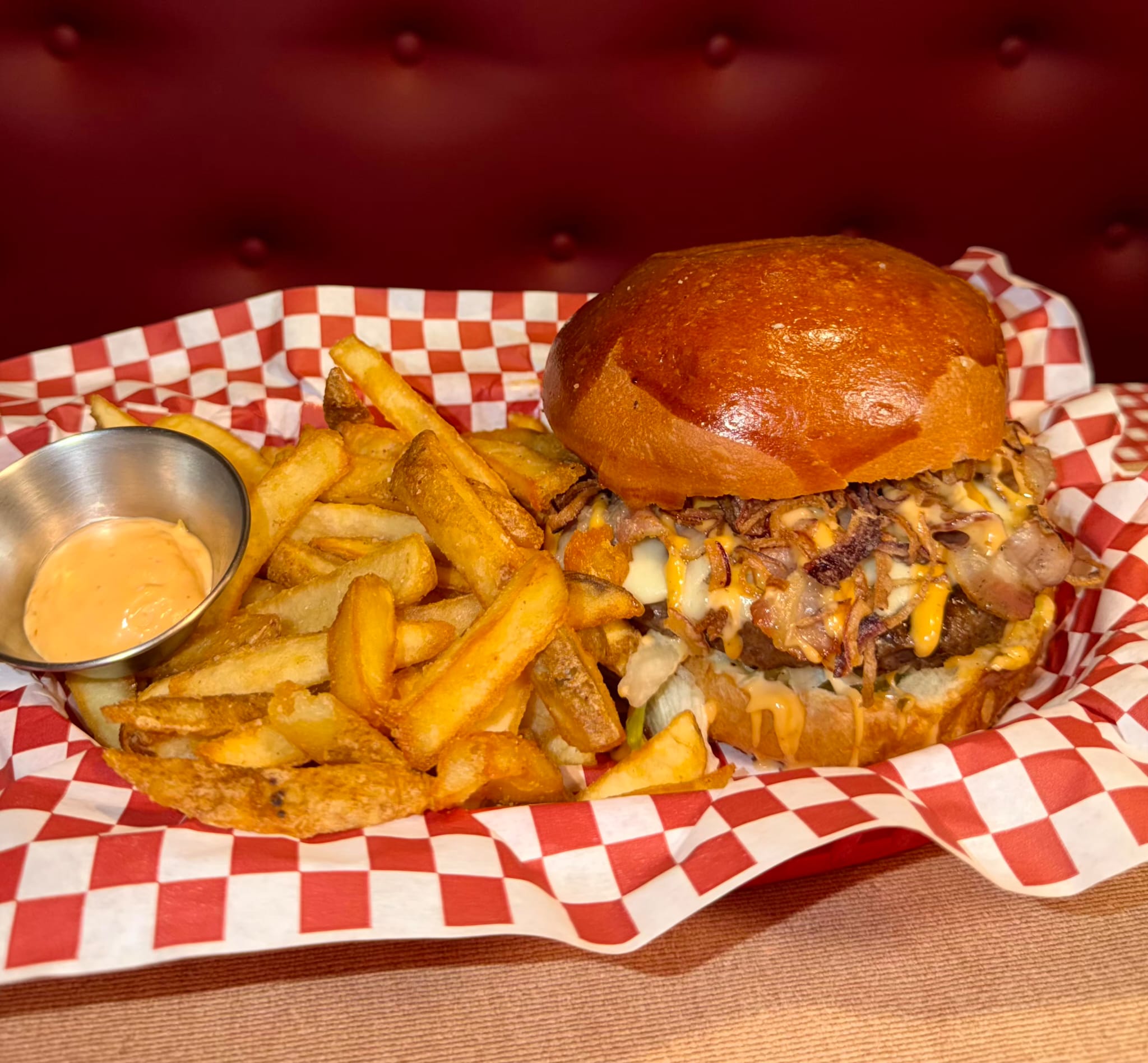The New YorkerBun artigianale, hamburger di manzo homemade 250g, bacon, smoked cheese, pickles, iceberg, crispy onion, salsa est coast accompagnato da french fries