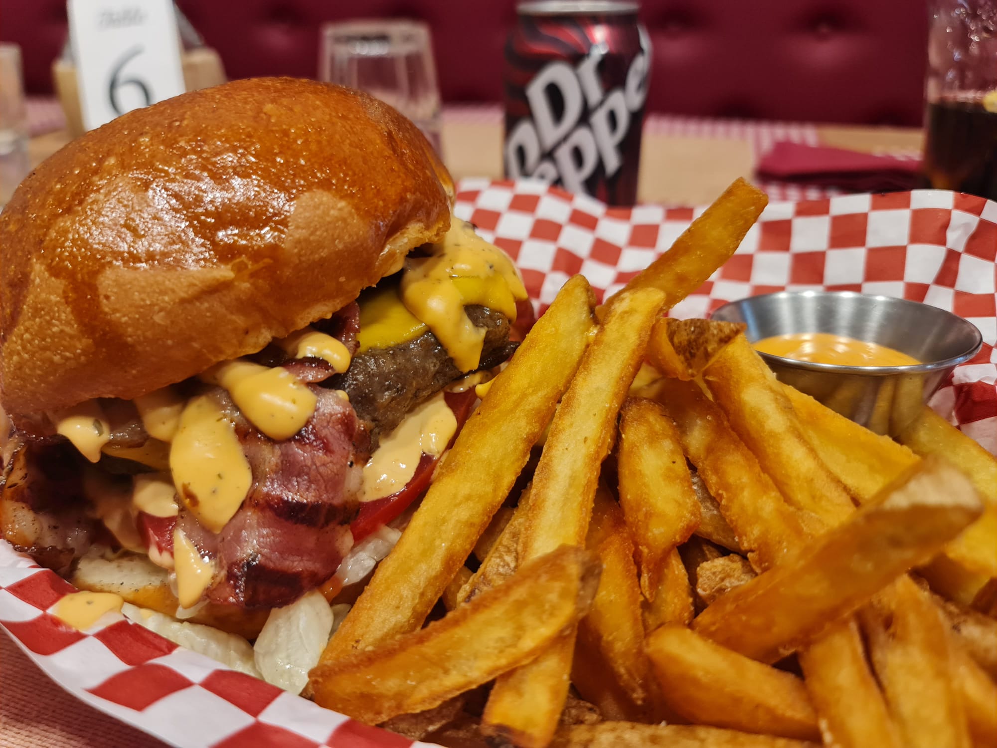 Bacon cheese burgerBun artigianale, hamburger di manzo homemade 250g, cheddar, bacon croccante, iceberg, pomodoro, salsa baconnaise accompagnato da french fries