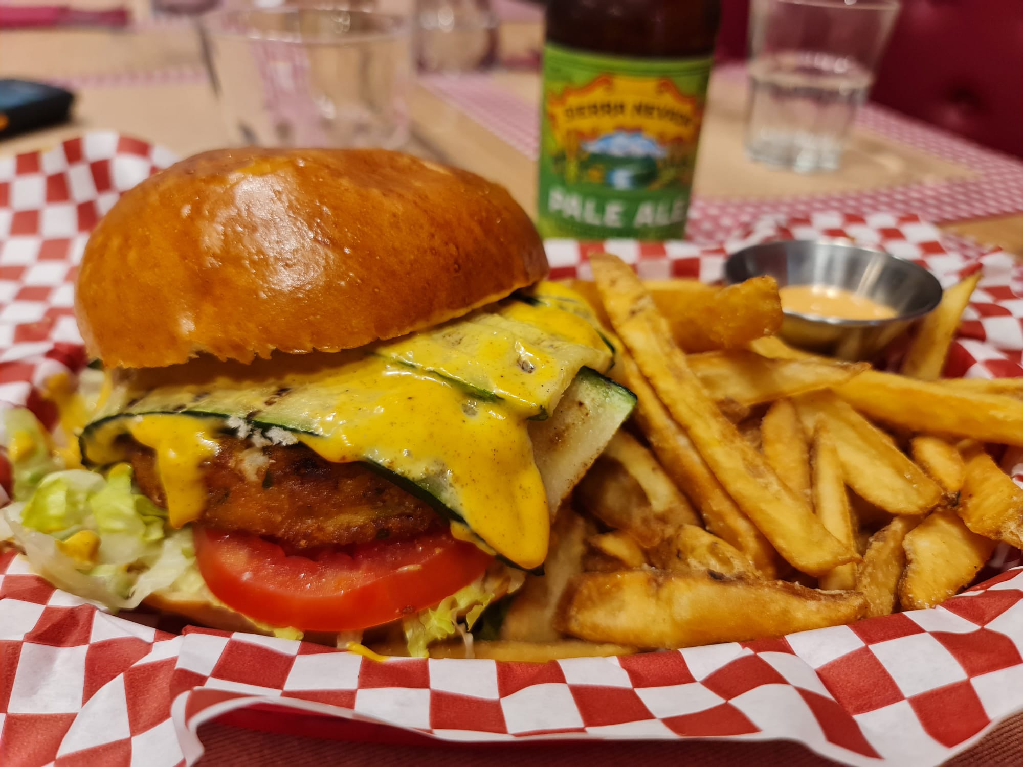 Sunny vegetarian burgerBun artigianale, hamburger vegetariano, iceberg, pomodoro, zucchine grigliate, salsa curry mango, accompagnato da patate fritte.