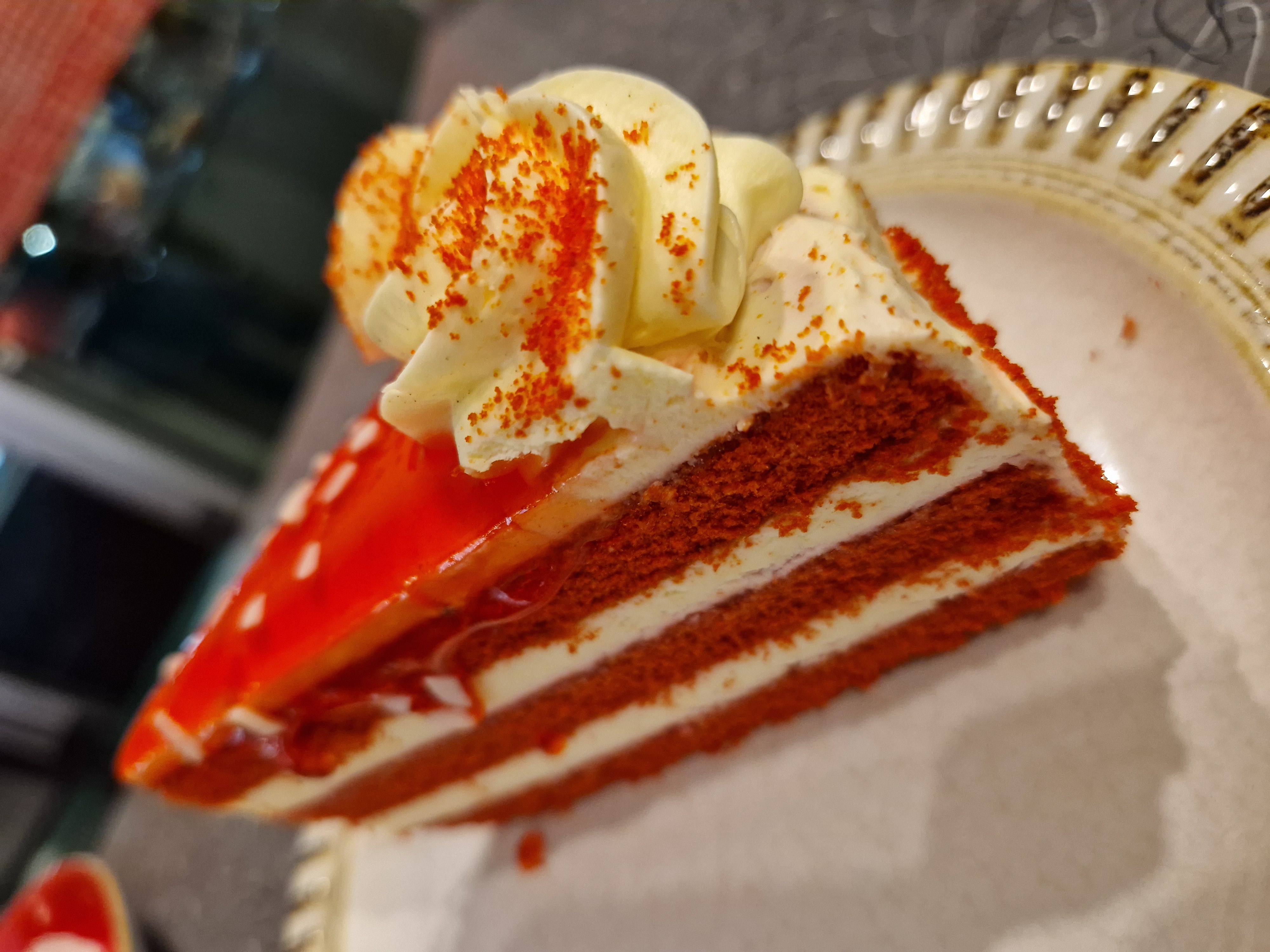 Red Velvet Cake pistacchioTorta rossa con crema alla vaniglia e pistacchio con panna montata.