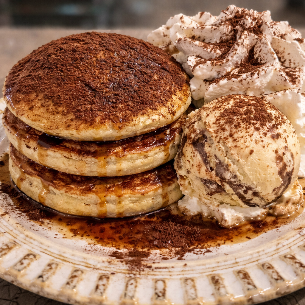 Alfredomisù3 pancakes homemade col gelato al tiramisù panna montata e cacao. è colazione, è dessert, è miracolo.