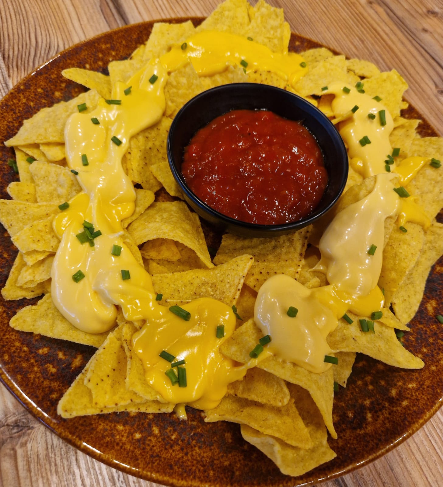 Nachos cheeseCroccanti triangoli di mais caldi con salsa messicana, formaggio cheddar e erba cipollina
