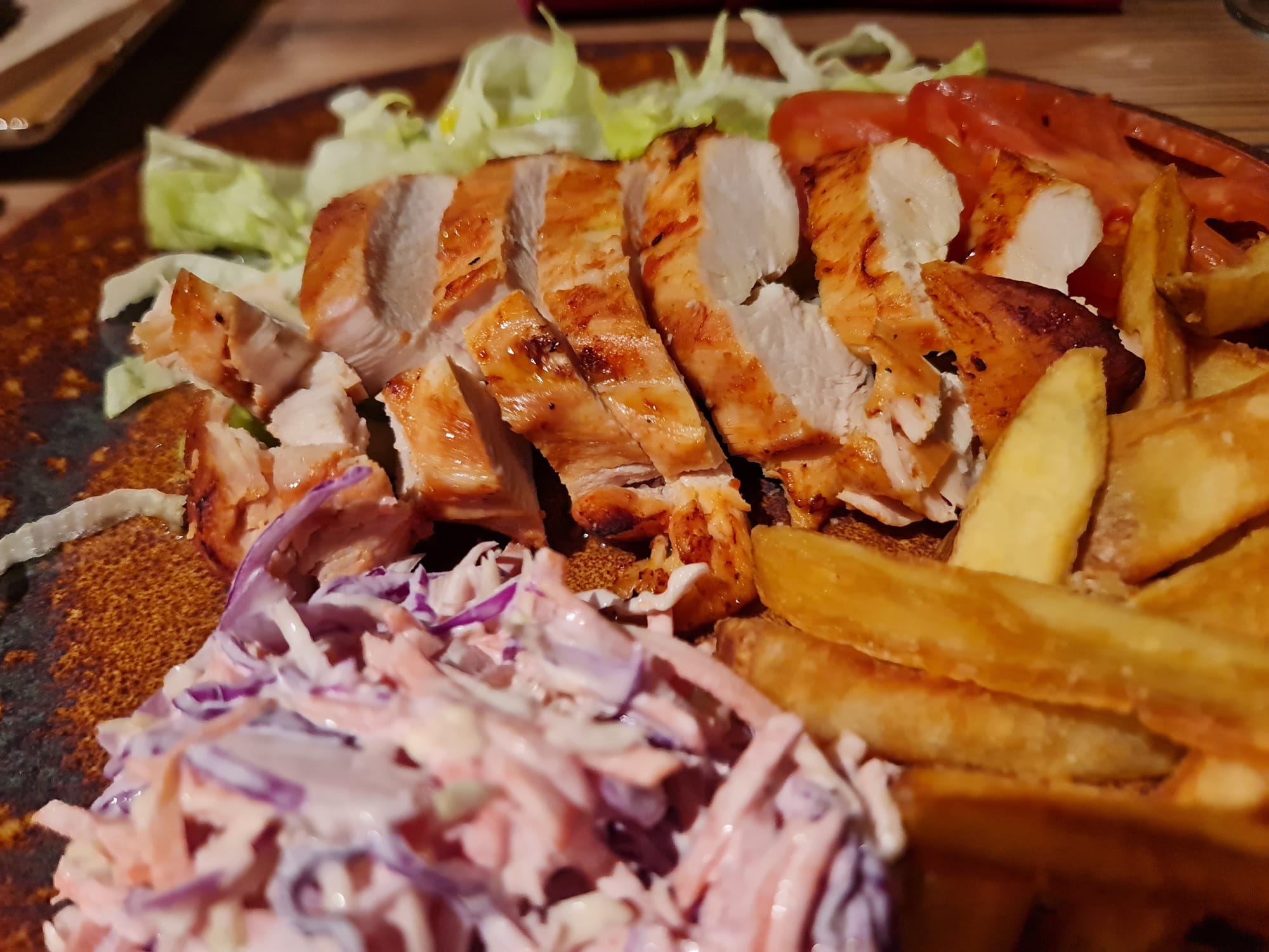 Luigi's grilled chickenGustoso petto di pollo cotto sottovuoto, servito su letto di insalata con patatine fritte e colorado slow.