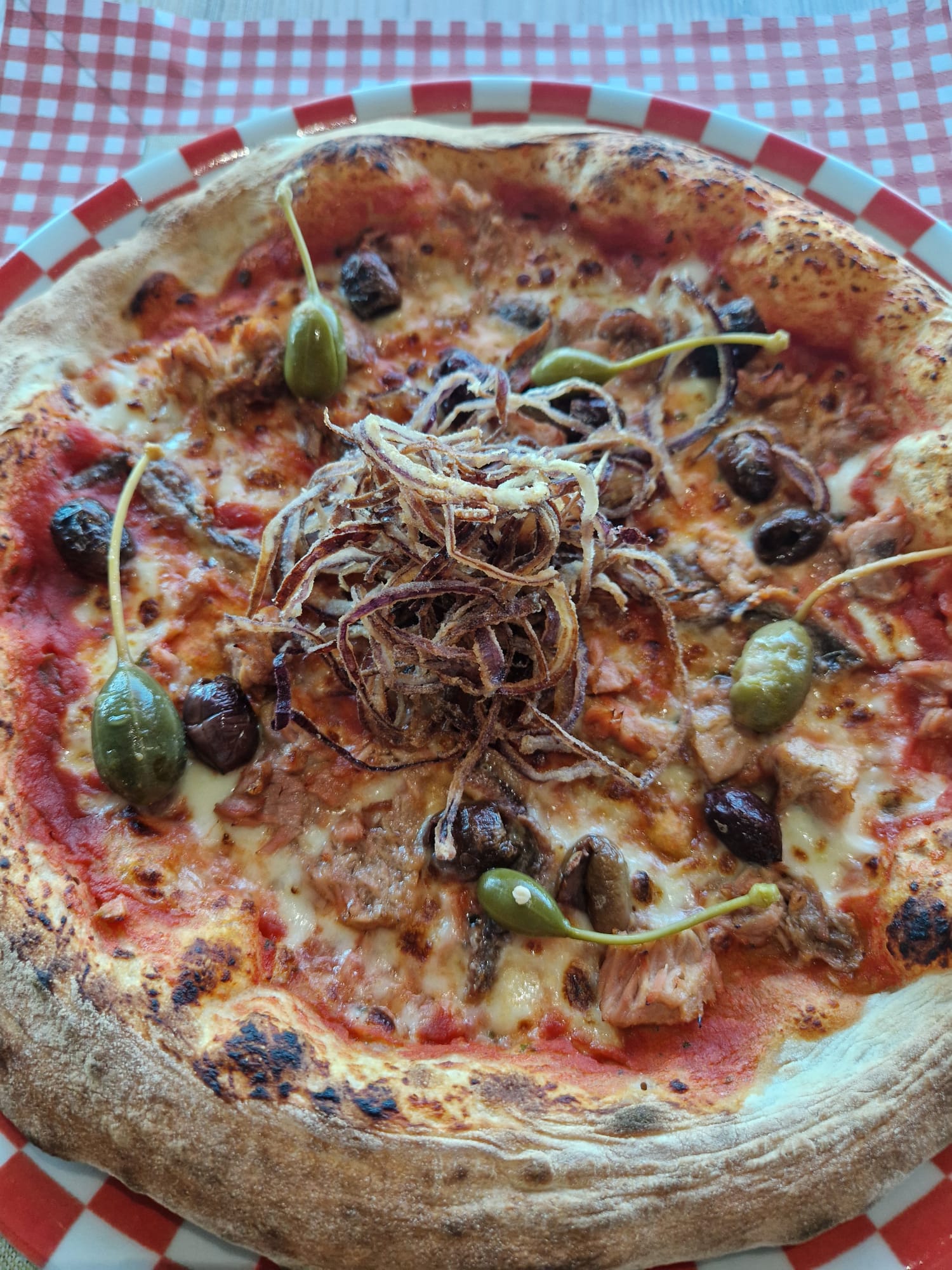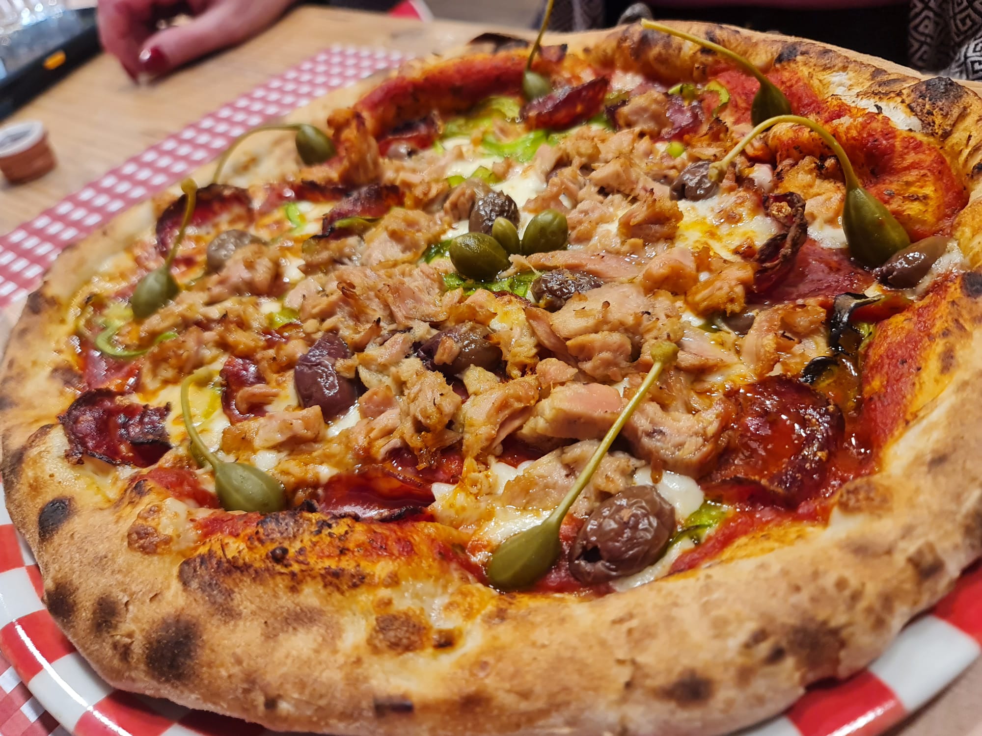 Frank SinatraPomodoro, mozzarella, fiori di cappero, tonno, acciughe, olive taggiasche, cipolla croccante