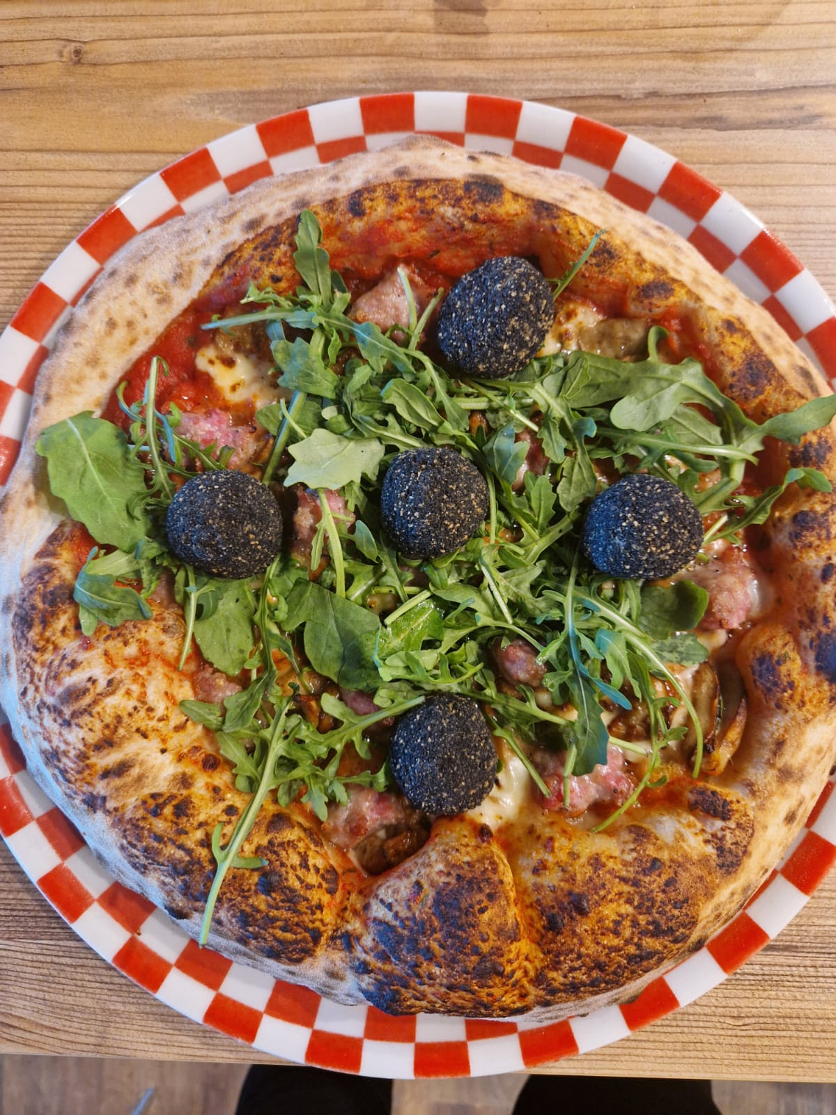 Frankie CarbonePomodoro. mozzarella, porcini, salsiccia, mozzarelline al tartufo, misticanza