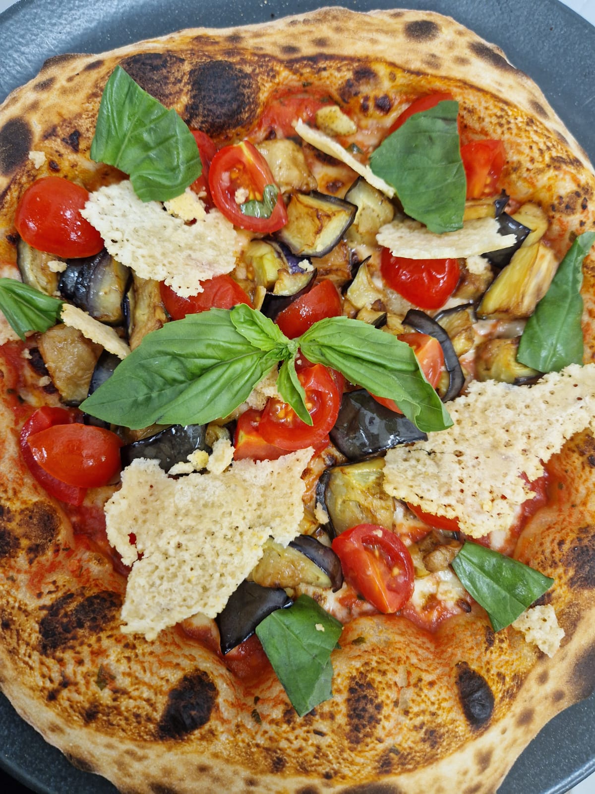 Zia CarmelaPomodoro, mozzarella, melanzane fritte, crumble di parmigiano, pomodorini saporiti, basilico