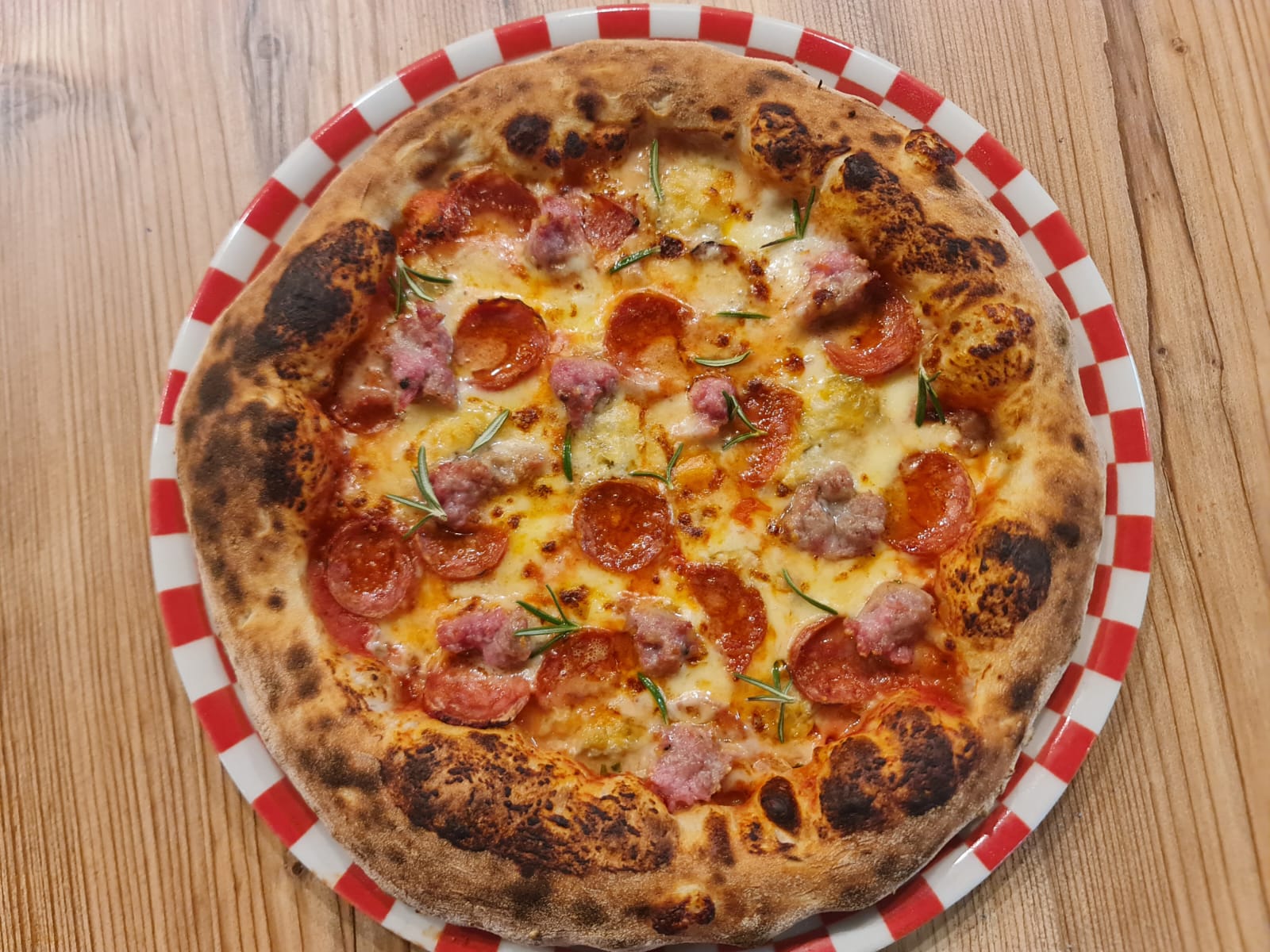 ClemenzaPomodoro, mozzarella, gorgonzola, salsiccia, salamino piccante, rosmarino
