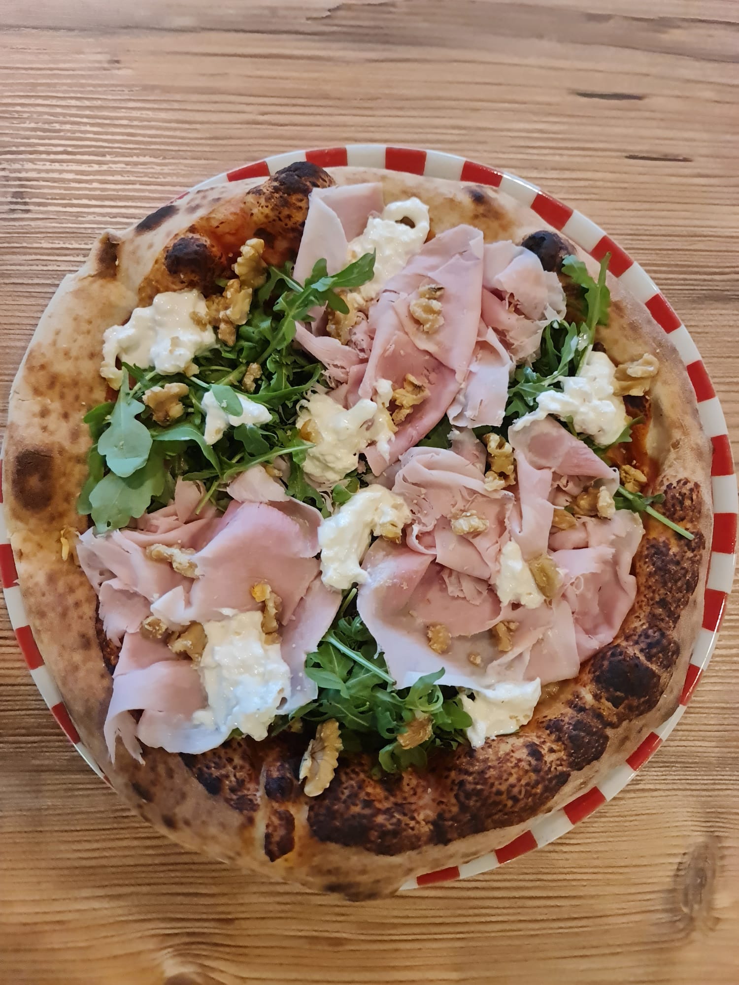 Joe di MaggioPomodoro, mozzarella, prosciutto cotto alle erbette, rucola, stracciatella, noci