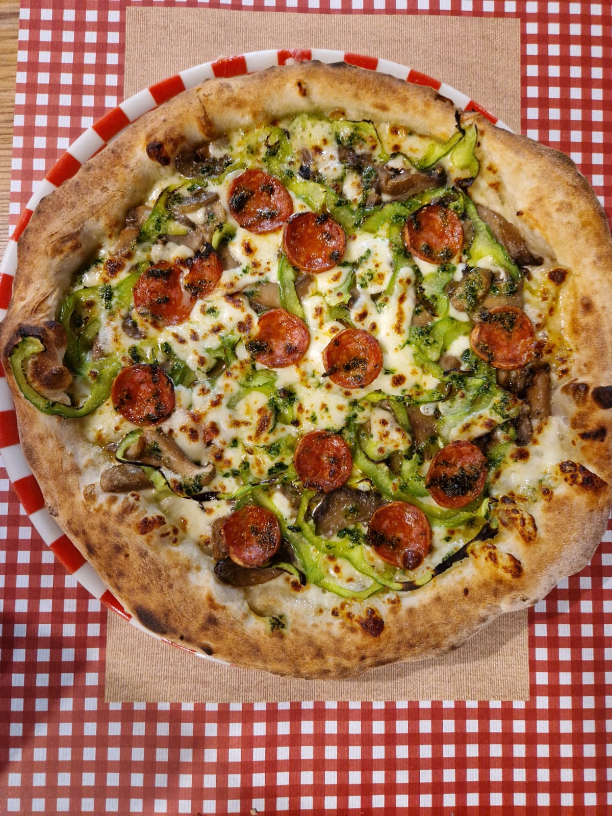 Mamma miaMozzarella, salsa aglio, funghi, peperoni verdi, salamino, extra mozzarella