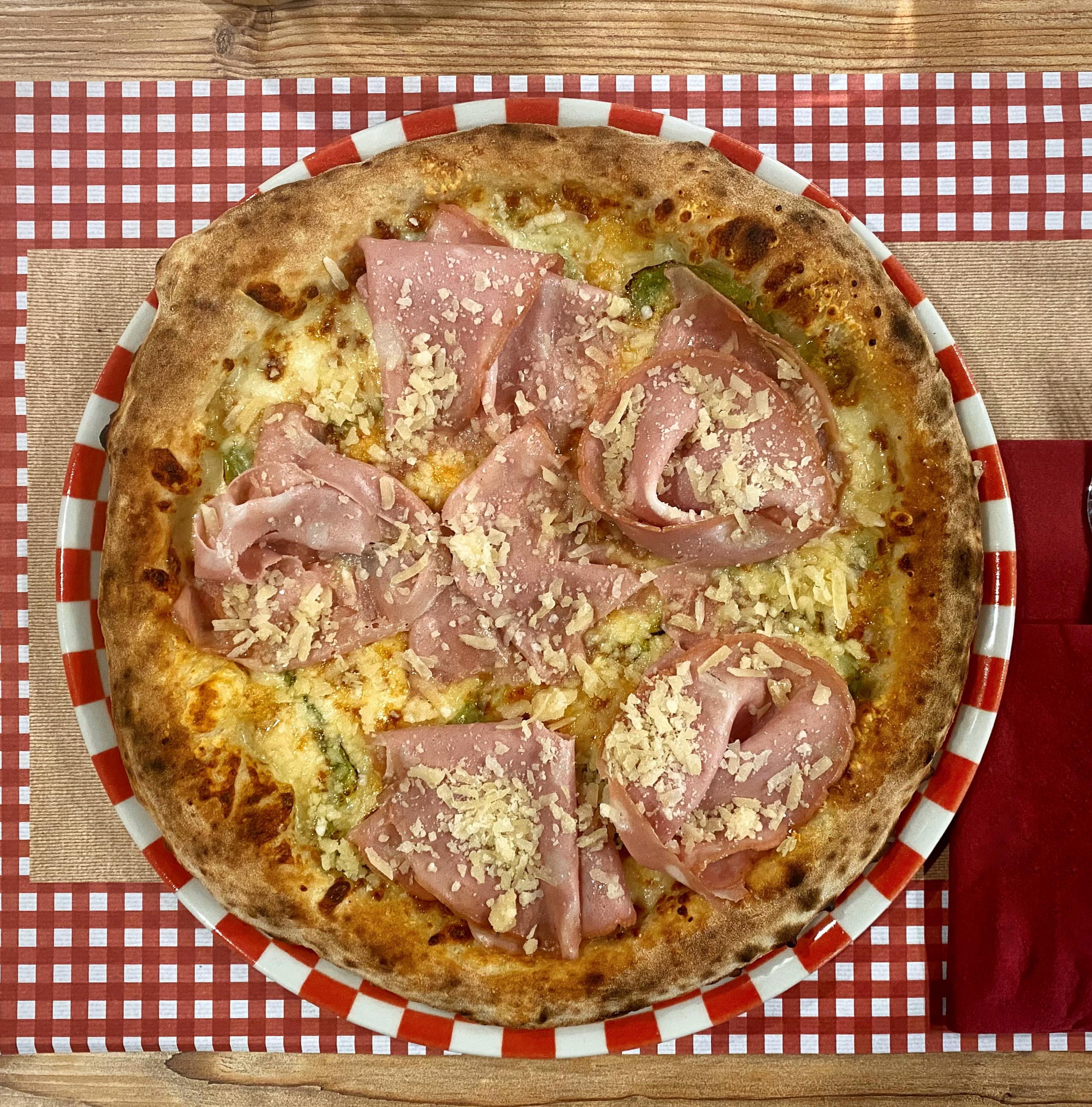 La MariettaMozzarella, peperoni julienne, grana in cottura, mortadella, parmigiano a scaglie in uscita.